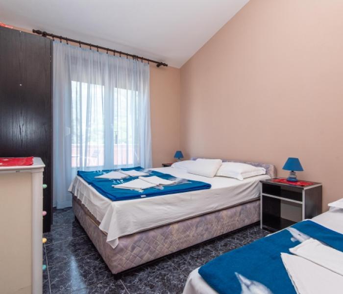 Apartman je veličine 40 kvadrata kapaciteta 5 osoba sa dodatnim ležajem se mogu smjestiti i 6 osoba. Od prostorija posjeduje spavaću sobu, dnevnu sobu a kuhinjom i kupatilo. Posjeduje 2 terase manju terasu i veliku terasu veličine 12 kvadrata. Kuhinja je opremljena posuđem i osnovnim kuhinjskim uređajima. Apartman je klimatizovan, posjeduje TV sa satelitskim kanalima, besplatan internet, parking prostor u okviru objekta.